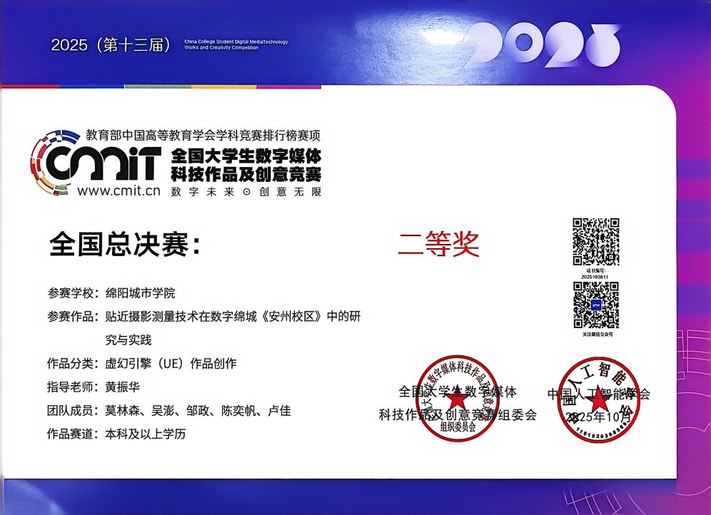 10月26日,颁奖典礼在哈尔滨工业大学隆重举行。绵阳城市学院两支参赛队伍均获国家级二等奖,为本次国赛征程画上圆满句号。据统计,学校在本届赛事中共组织160余支队伍参与初赛,作品覆盖虚拟现实与游戏、虚幻引擎(UE)创作等多个方向,累计获四川赛区一等奖2项、二等奖7项、三等奖11项,国家级二等奖2项,整体成绩喜人,充分体现学子在数字媒体科技领域的创新活力与技术实力。
