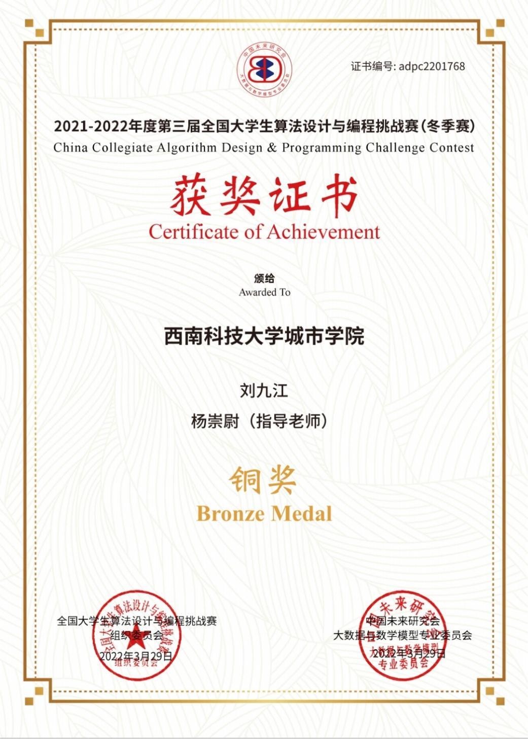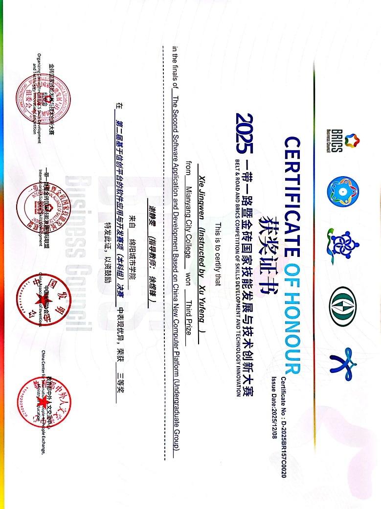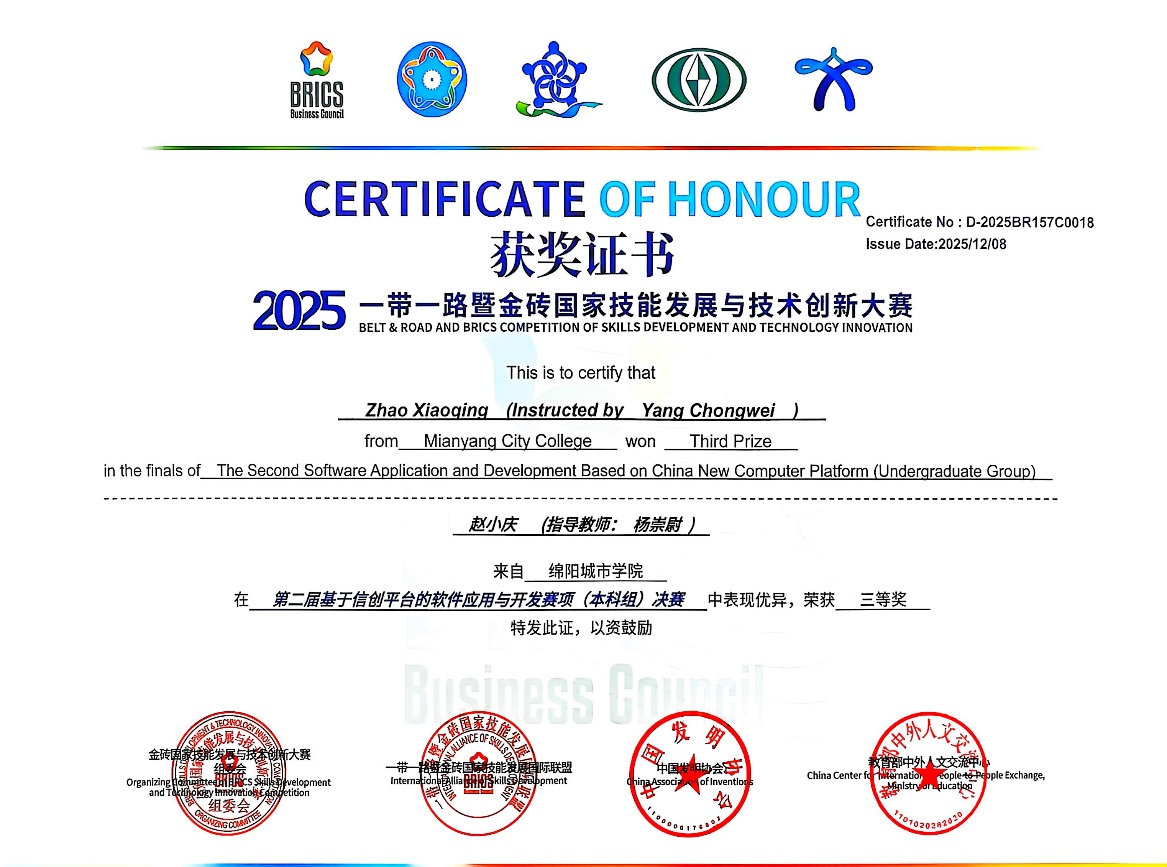 学生在全国计算机设计大赛、蓝桥杯、全球校园人工智能算法精英大赛、中国国际大学生创新大赛、挑战杯、一带一路暨金砖国家技能发展与技术创新大赛等赛事中斩获多项国家级、省级奖项。