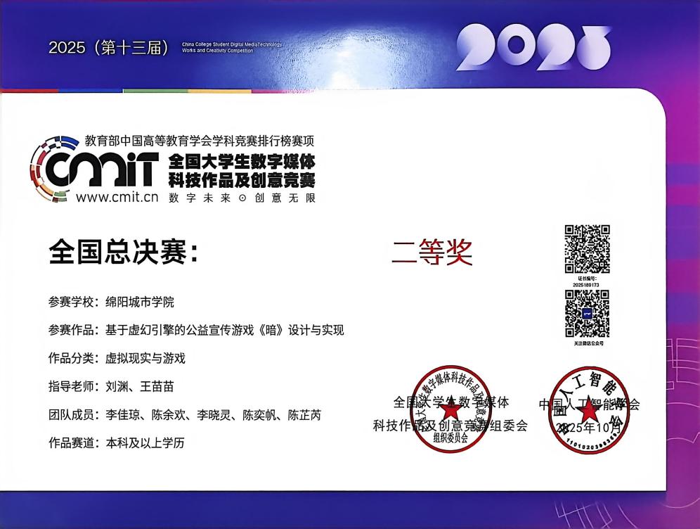 金秋结硕果,捷报映初心。近日,第十三届全国大学生数字媒体科技作品及创意竞赛全国总决赛在哈尔滨圆满落幕。绵阳城市学院现代技术学院选派的两支参赛队伍凭借出色的专业素养与创新实力,双双荣获国家级二等奖,充分彰显了学校在数字媒体领域应用型人才培养的扎实成效,也为学科竞赛成绩册再添亮眼一笔。